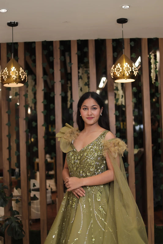 Sold outTrendy Olive Green Designer Net Gown