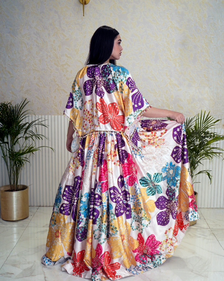 Vibrant Multicolor Flower Printed Half Shrug Style Modern Lehenga Dress